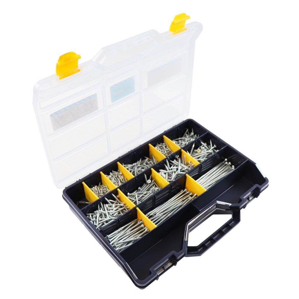 Kunststof assortimentkoffer van TAYG gevuld met een mooi assortiment Proftec spaanplaatschroeven staal verzinkt platkop TX-drive. Met deze handige gevulde koffer met schroeven heb altijd een passende schroef voor elke klus bij de hand. Alle schroeven in deze koffer hebben een TX-20 drive en er zitten 2 bits gratis bij.