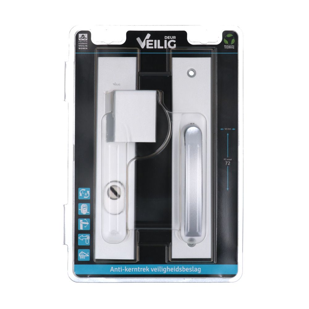 Het Veilig veiligheidsbeslag is leverbaar in een kruk-kruk en duwer-kruk uitvoering en is beschikbaar in de meest gangbare pc-maten 55, 72 & 92.