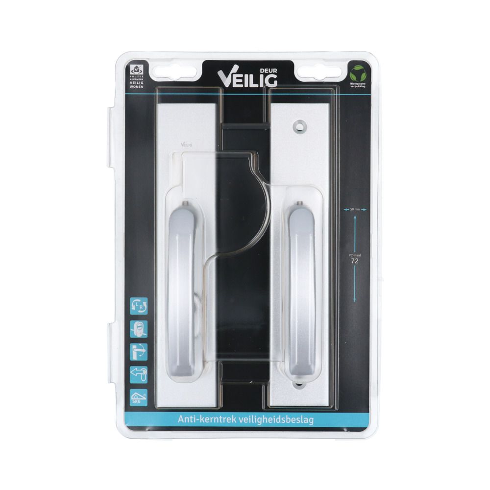 Het Veilig veiligheidsbeslag is leverbaar in een kruk-kruk en duwer-kruk uitvoering en is beschikbaar in de meest gangbare pc-maten 55, 72 & 92.