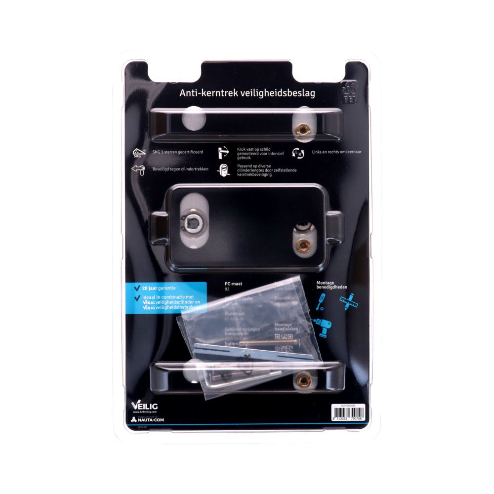 Het Veilig veiligheidsbeslag uit de 2200/2300 serie is SKG drie sterren gecertificeerd en beschermt tegen kerntrekken, een veelvoorkomende inbraakmethode. Het deurbeslag bestaat uit een binnenschild en een buitenschild met verstelbare kerntrekbeveiliging. Doordat deze beveiliging verstelbaar is, past deze nagenoeg op elke cilinder en kunt u in de meeste gevallen uw huidige cilinder blijven gebruiken.