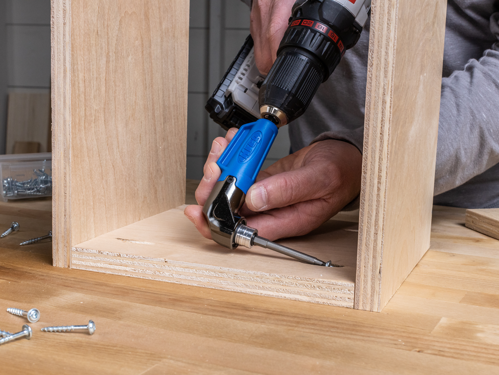 Verander elke boormachine in een 90° boormachine met de Kreg 90° Pocket-Hole Driver. Met dit compacte boorhulpstuk kunt u schroeven aandraaien op plaatsen waar u normaal met uw boormachine niet bij kunt. De meegeleverde 75 mm schroefbit heeft een magnetische punt die in de kop van een schroefgat vastklikt en er niet uit kan glijden - zodat u met vertrouwen schroeven kunt aandrijven, waar ze zich ook bevinden. Dit hulpstuk werkt met alle zeskantschachtbits, waardoor het niet alleen geschikt is voor zakgatschroeven. Dankzij het ergonomische ontwerp kunt u de 90°-zakgatschroevendraaier gemakkelijk met één hand vasthouden terwijl u met de andere hand de boormachine bedient. Hij is ook geschikt voor gebruik met een slagboormachine. Wanneer u schroeven moet aandraaien in krappe ruimtes, kunt u rekenen op de 90°-zakgatschroevendraaier om de klus te klaren.